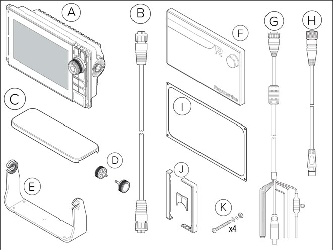 | Delivery | A: MFD display AXIOM 9 PRO-RVX, B: RayNet on RayNet cable, 2 m, C: mounting bracket cover, D: thumbscrews (2 pcs.), E: mounting bracket, F: sun cover, G: voltage / video and NMEA0183 cables - straight male, 1.5 m, H: SeaTalkNG adapter to NMEA2000 (female), Device-Net, I: gasket for recessed mounting, J: side panels, Home and Start button, K: mounting bolts ( 4 pcs.) As well as a quick guide, a warranty card, Raymarine window stickers |