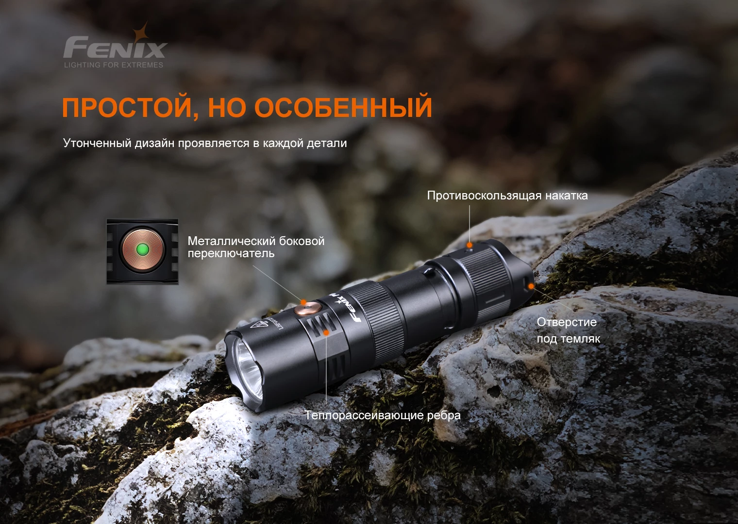 Включение/выключение и моментальное включение осуществляется при помощи тактической хвостовой кнопки, а шесть режимов свечения выбираются посредством бокового переключателя, включая режим стробоскопа. Носите модель так, как вам удобно — на рюкзаке, ремне или системе MOLLE с двусторонним зажимом для тела. Компактный и надёжный корпус со степенью пыле- и водонепроницаемости IP68 оптимально подходит практически для любой деятельности на природе.